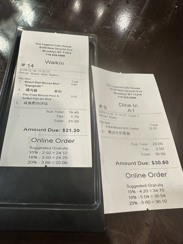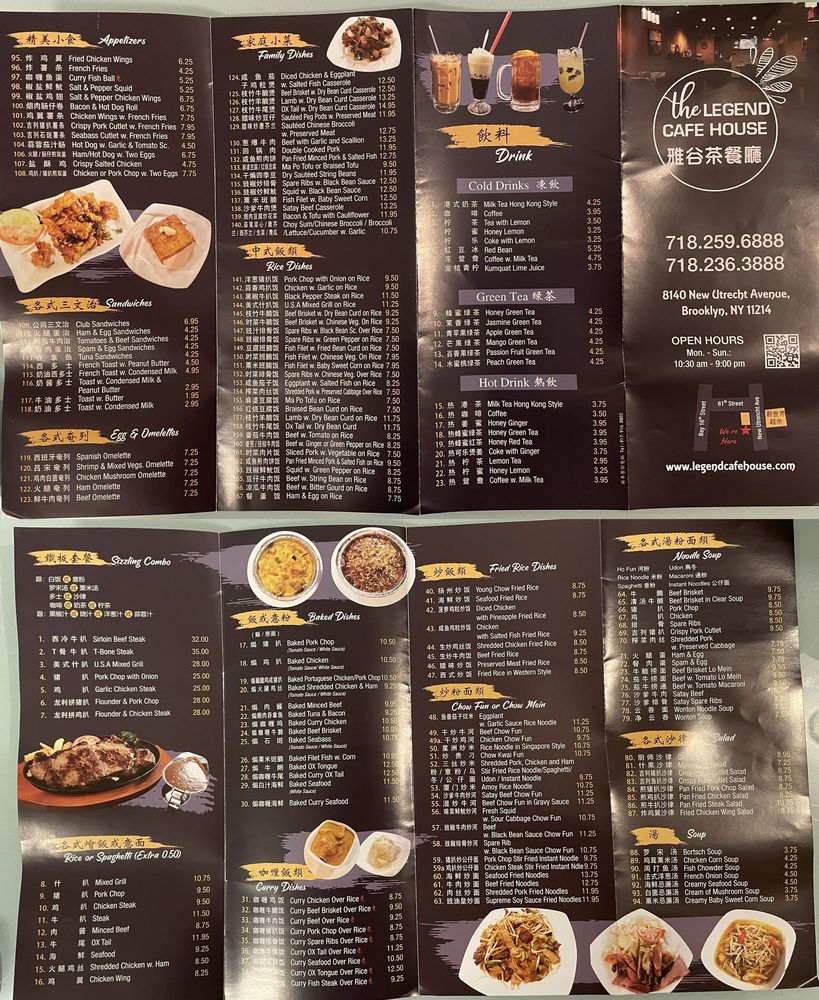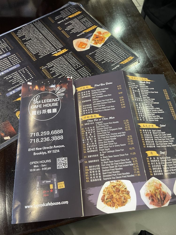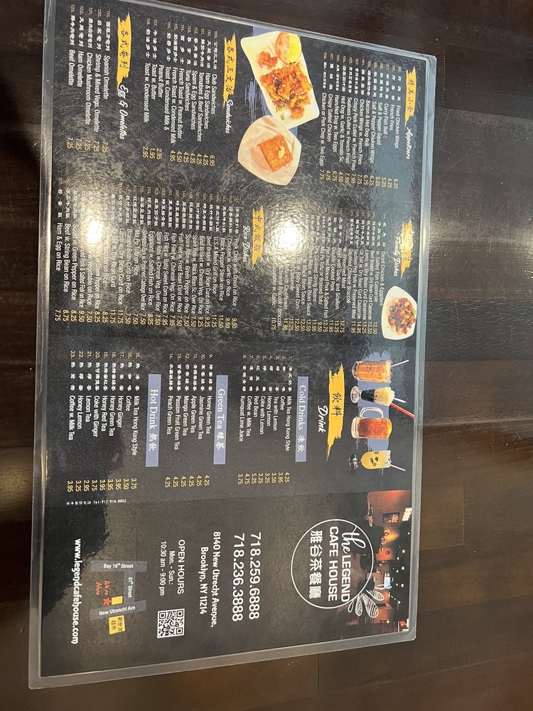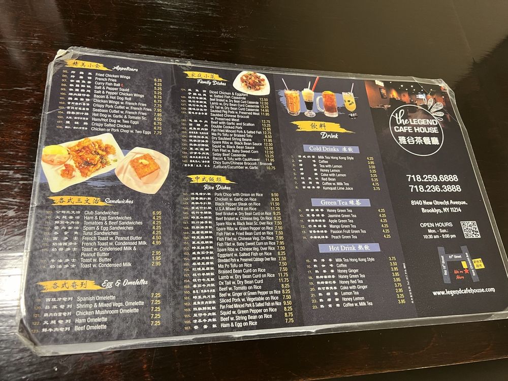 Located in Brooklyn, NY, The Legend Cafe House offers a diverse menu of Portuguese cuisine, juice bar selections, and sandwiches. This restaurant provides a range of amenities, such as outdoor seating, waiter service, free Wi-Fi, and delivery options. Customers praise the generous portion sizes and flavorful dishes, with favorites including the baked beef minced spaghetti and Portuguese chicken over rice. Despite some minor service delays, patrons appreciate the delicious and affordable HK-style food, especially the French toast and salt and pepper squid. The cozy atmosphere and variety of menu options make The Legend Cafe House a must-visit for those craving authentic and satisfying dishes in a casual dining setting.